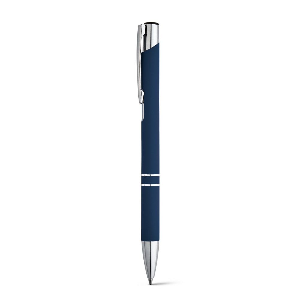 Alumīnija lodīšu pildspalva ar krāsainu korpusu un gumijas apdari. Melna tinte. ø10 x 137 mm