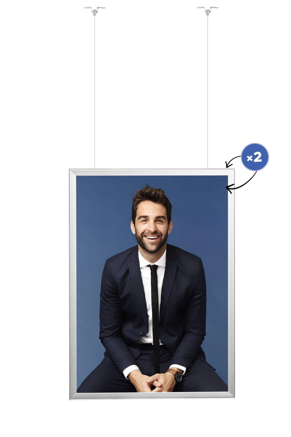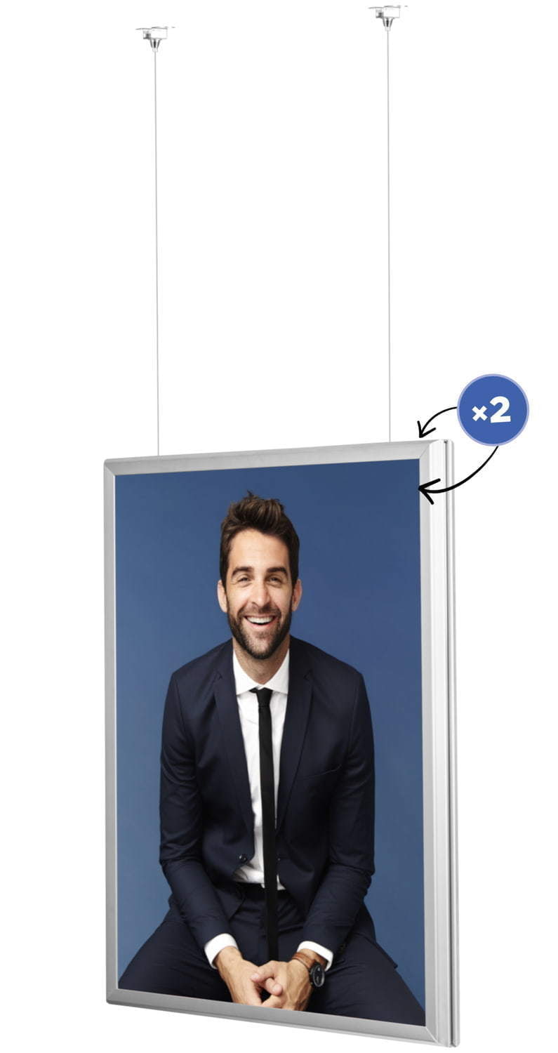 Ideāls risinājums lieliem veikaliem un iepirkšanās centriem. Šis Premium tipa rāmis ļaus attēlot grafiku no abām pusēm. Sistēma “clip-clap” padara ātru plakāta nomaiņu, kas aizņem dažas sekundes. Spēcīgas tērauda troses garantē drošu un stabilu rāmja piekari. Komplektā ietilpst kronšteini rāmja uzstādīšanai pie griestiem.