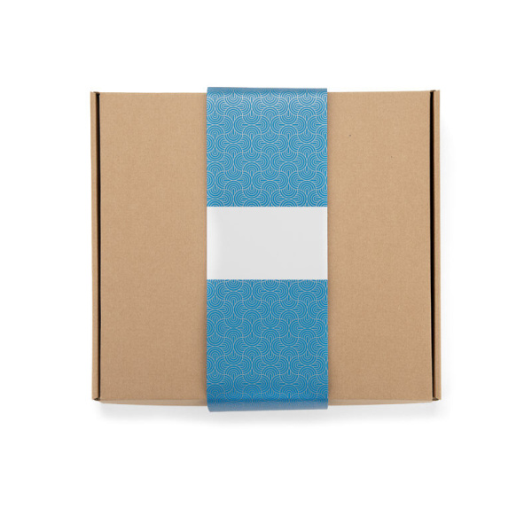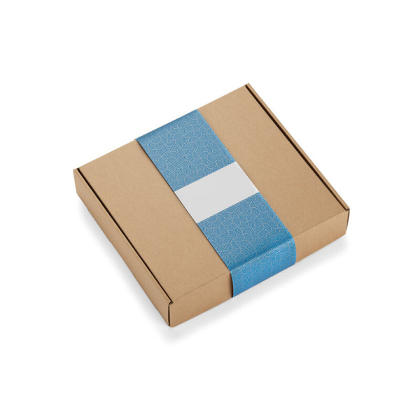 AZUL “S” dāvanu kastes komplekts ir gatavs, elegants risinājums korporatīvo dāvanu radīšanai. Tajā ietilpst izturīga kraftkartona kaste, smilškrāsas papīra pildviela (sertificēta saskarei ar pārtiku) un zila iesaiņojums ar sudraba, pēc pasūtījuma izstrādātu rakstu, kas izveidots ekskluzīvi BLUE COLLECTION. Iesaiņojums nodrošina elegantu apdari un ir viegli lietojams, pateicoties pašlīmējošajai sloksnei. Komplekts ir pieejams trīs izmēros (S, M, L), tāpēc to ir viegli pielāgot plānotajam saturam.
