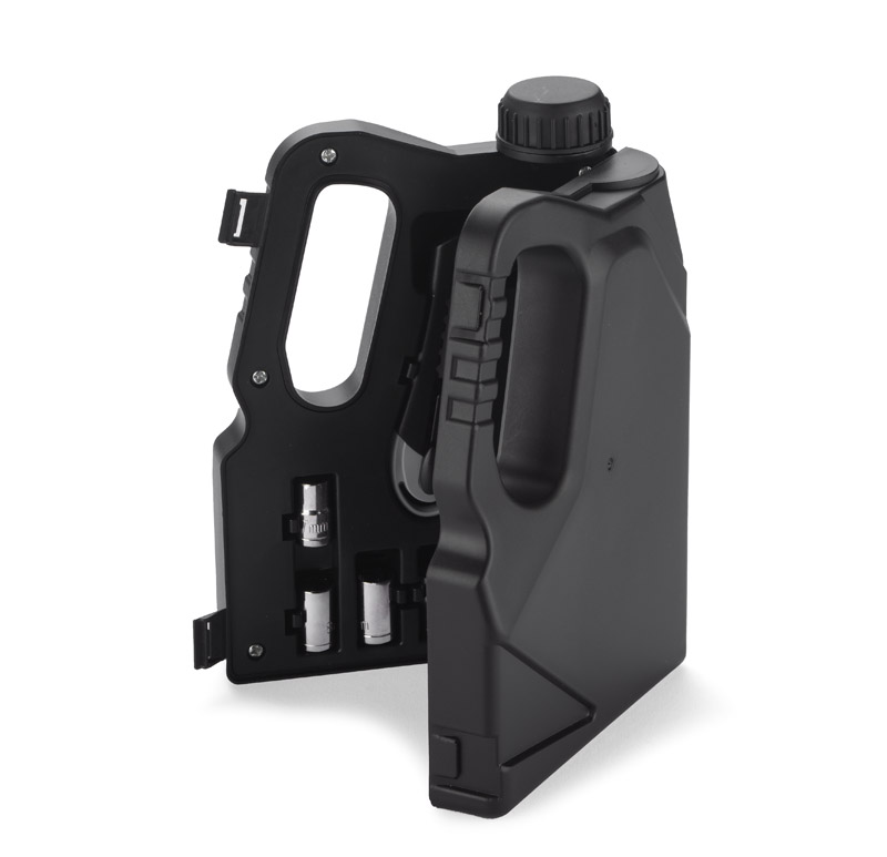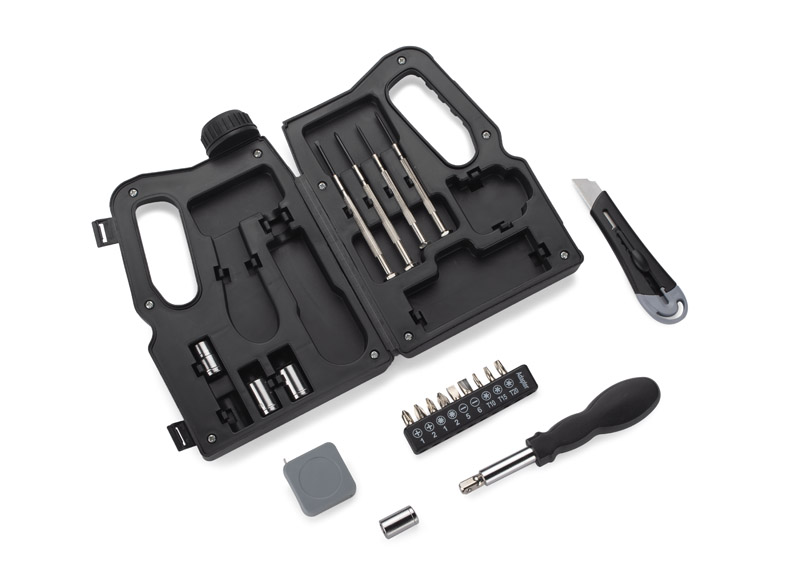 Komplekts, kurā ir daudz noderīgu instrumentu: četri skrūvgrieži, mērlente, nazis, četras uzgriežņu atslēgas un deviņi uzgaļi.