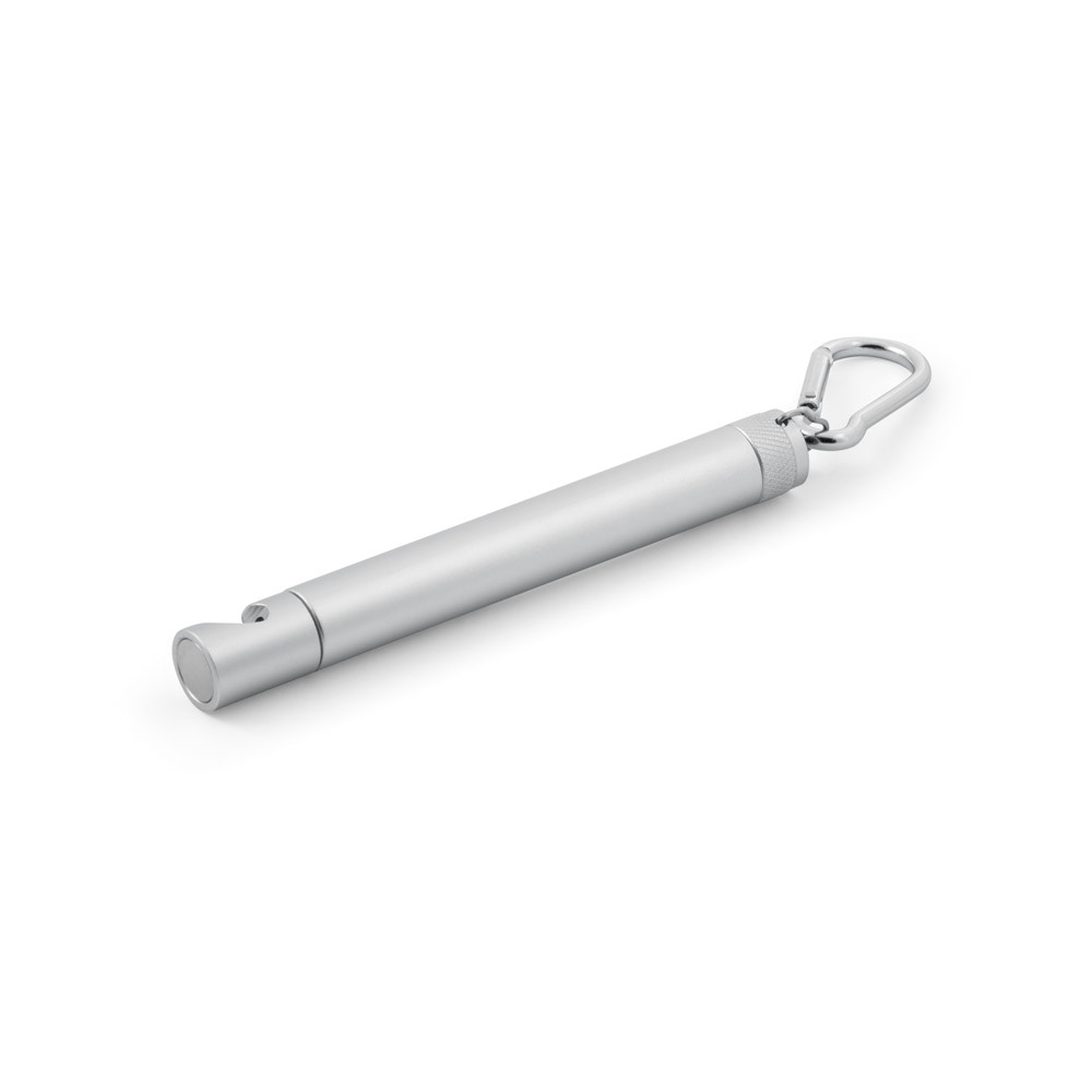 Alumīnija deglis ar COB LED, pudeļu atvērēju, karabīni un magnētu uz gala. Iekļautas 5 LR44 baterijas. ø15 x 130 mm