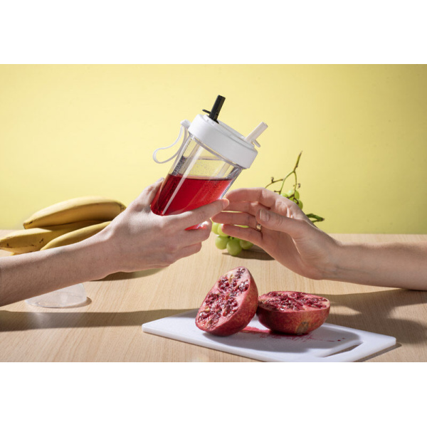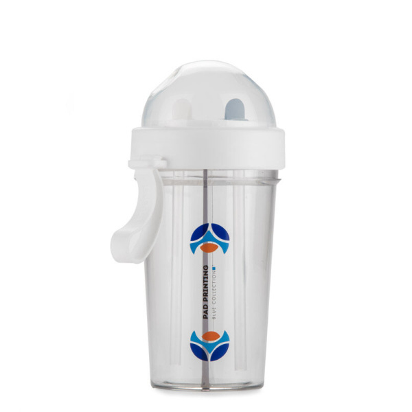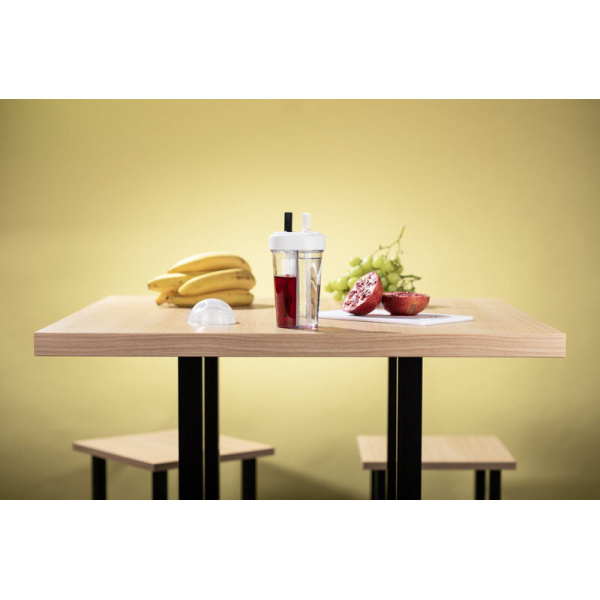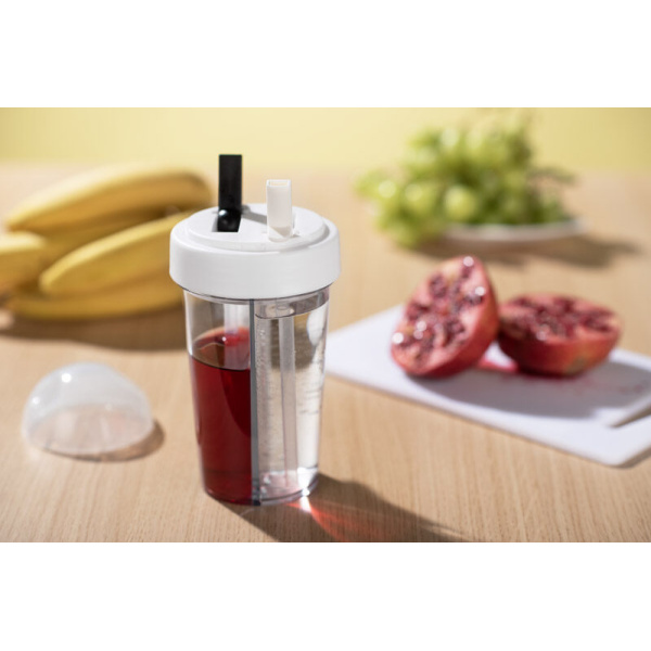 DUI 420 ml ir praktisks trauks ar diviem neatkarīgiem nodalījumiem, kas ļauj vienlaikus turēt divus dažādus dzērienus. Iebūvētie salmiņi ar salokāmiem iemutņiem (balti un melni) ļauj ērti dzert, nesajaucot šķidrumus. Skrūvējamais loks ar silikona rokturi nodrošina drošu satvērienu, un vāks ļauj aizvērt bidonu, kad salmiņi ir salocīti.