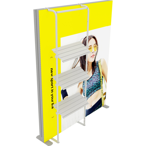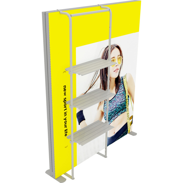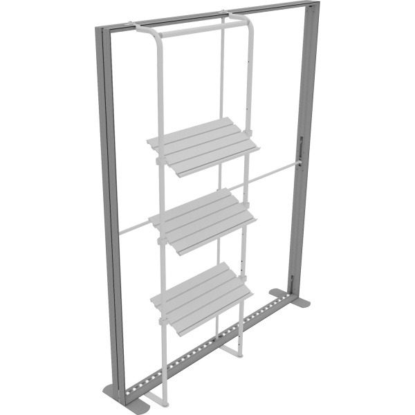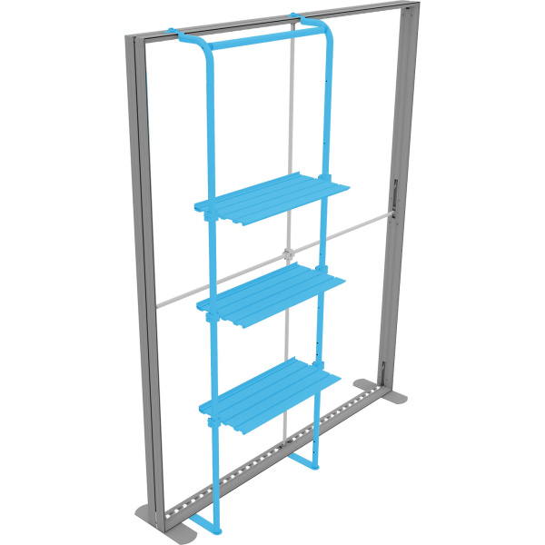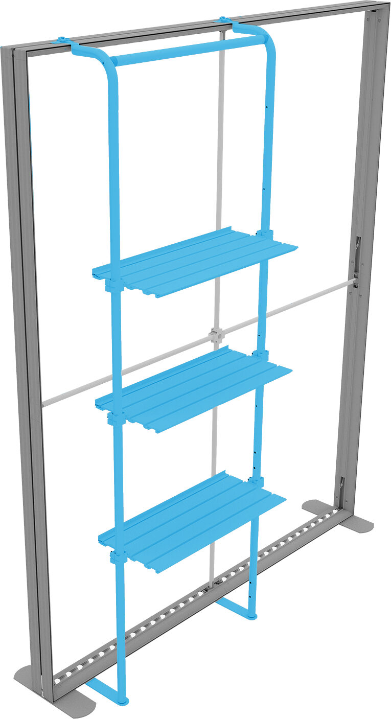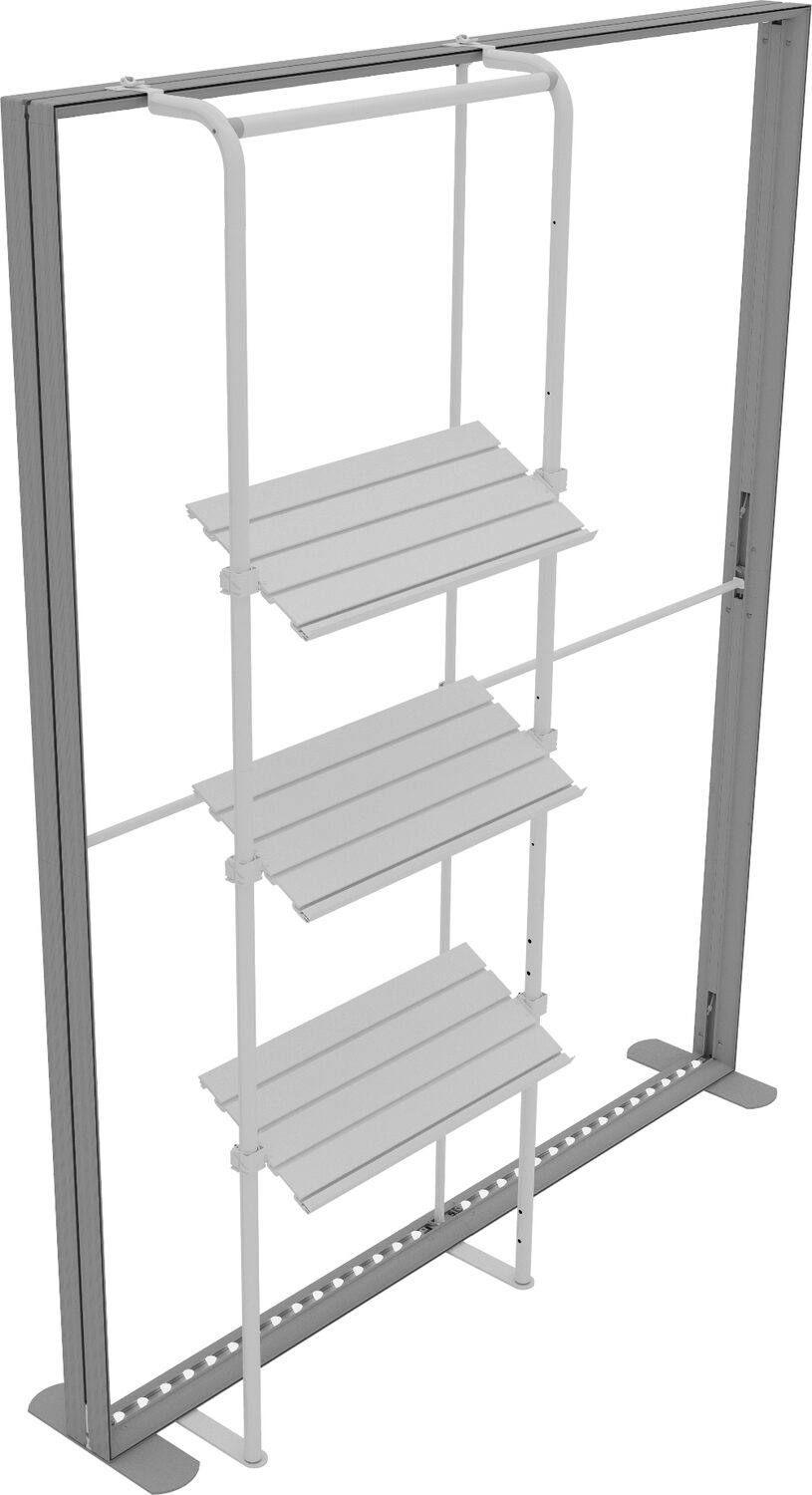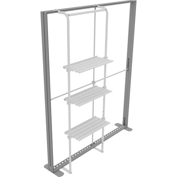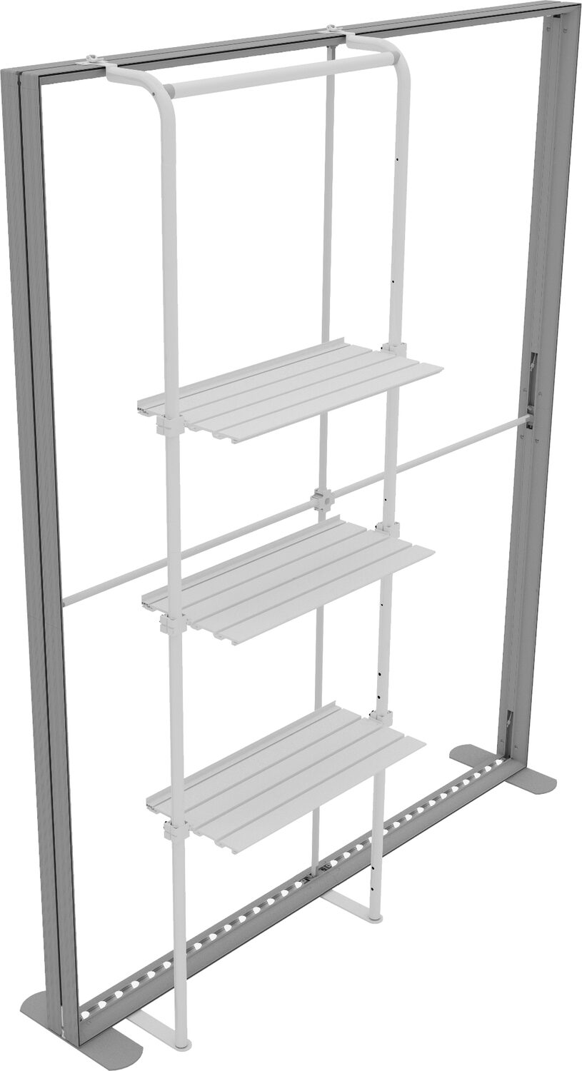Sistēmā ietilpst 3 balti plastmasas plaukti, kurus var novietot horizontāli vai pa diagonāli. Īpaša gala pietura plauktu malās neļauj parādītajiem produktiem slīdēt uz grīdas. Plaukti ir piestiprināti pie rāmja, izmantojot komplektā iekļautos savienotājus.Komplektā ietilpst: plauktu sistēma (plaukts, plaukti – 3 gab., savienotāji), montāžas instrukcija, transportēšanas soma, individuāla kastīte.