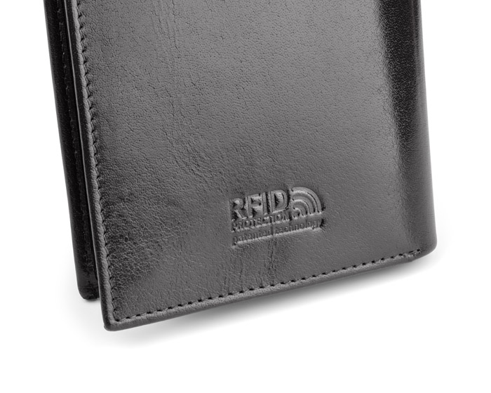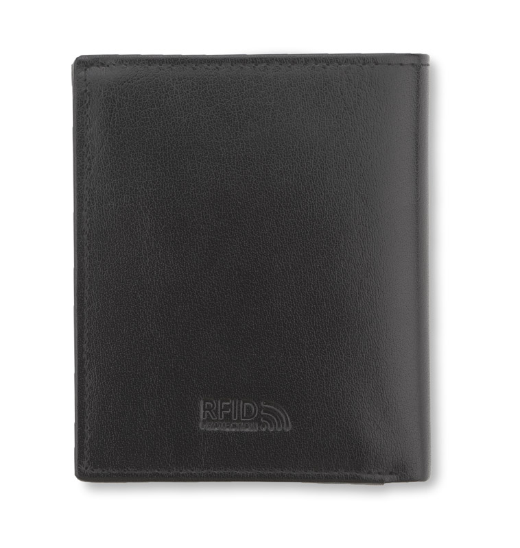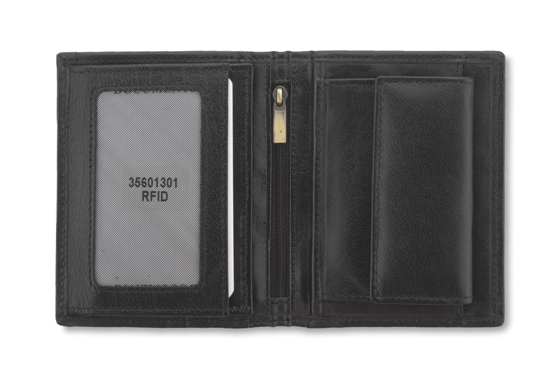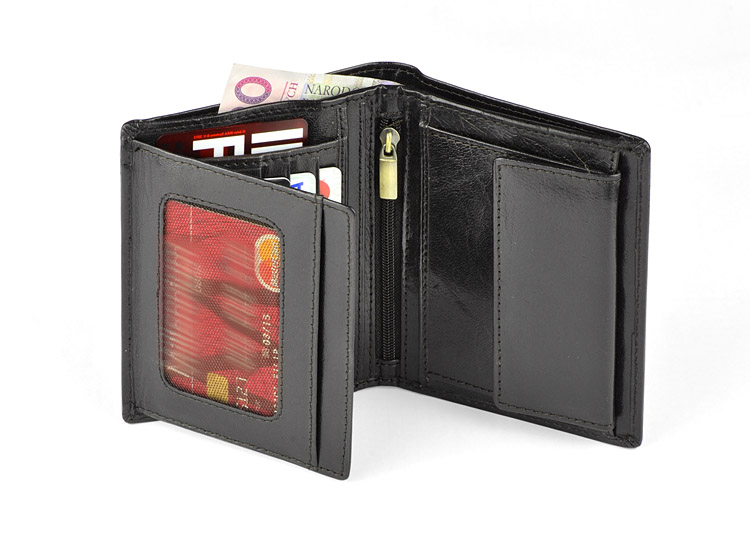 Ādas maks ar kabatu monētām, 2 kabatas banknotēm, 4 vietas kredītkartēm un 5 kabatas dokumentiem un viena kabata ar rāvējslēdzēju.