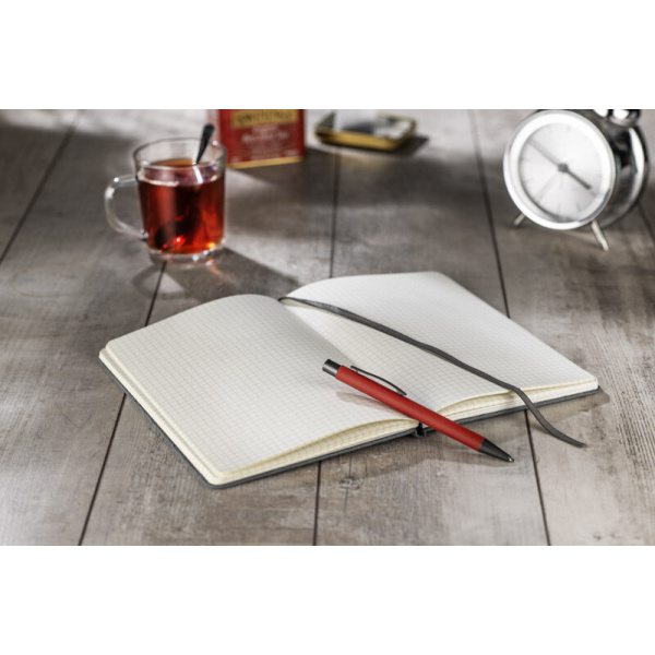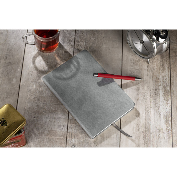 CANTRA A5 piezīmju grāmatiņa ir eleganta piezīmju grāmatiņa ar cieto vāku no samta ādai līdzīga materiāla. Iekšpusē ir balts rūtains papīrs (70 g/m²) un praktiska lente, kas darbojas kā grāmatzīme. Ideāli piemērots ikdienas notīm augstākās klases stilā.