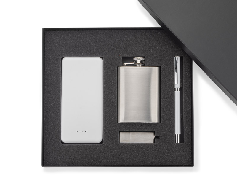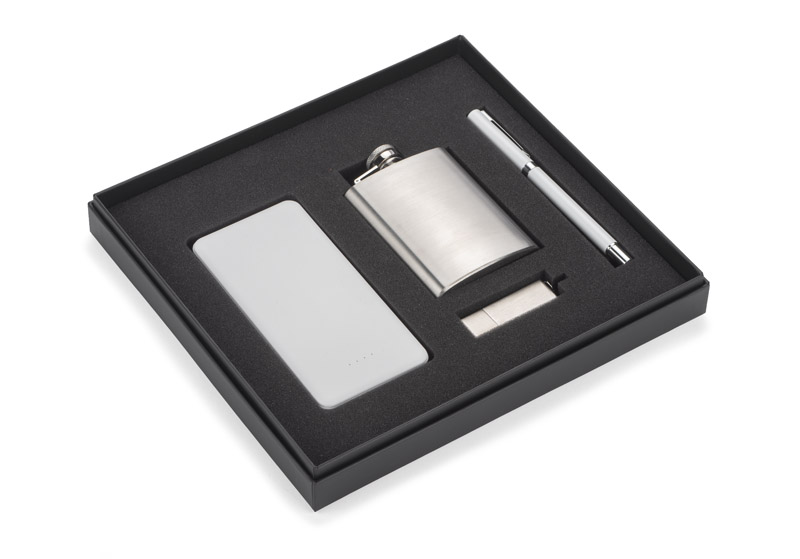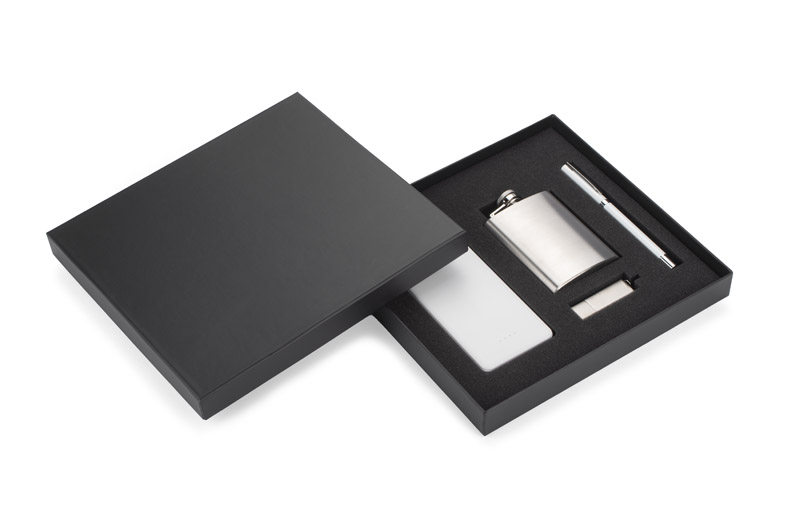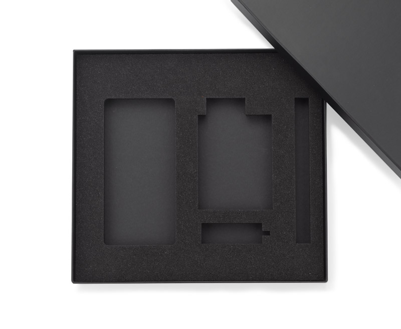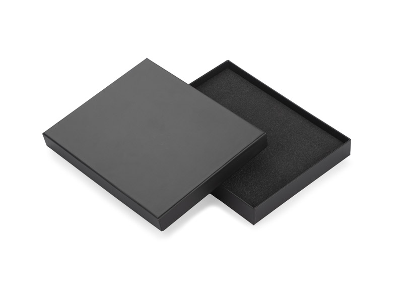 Melna kaste izgatavota no stipra, cieta materiāla, matēta. Iekšpusē tas ir izklāts ar putām, kuras var pielāgot izvēlētajiem produktiem. Iespēja izveidot savu komplektu.