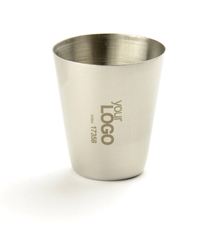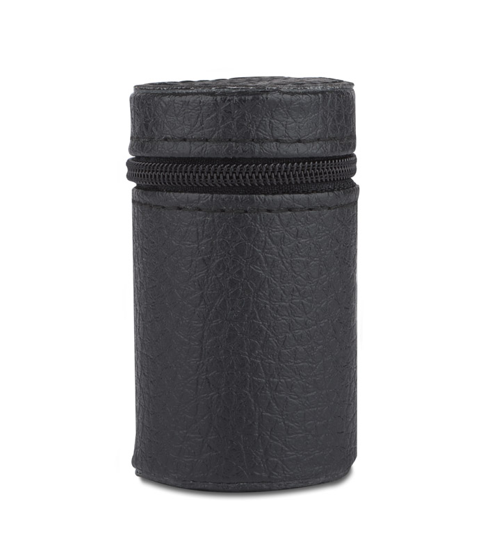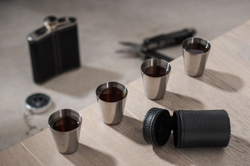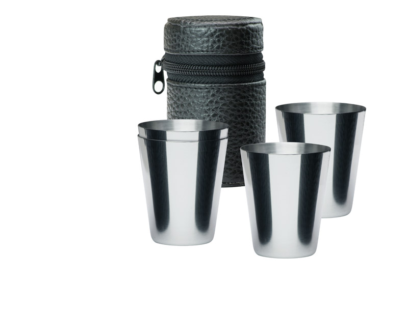 Četras 30 ml tērauda glāzes, iepakotas ādai līdzīga materiāla maciņā ar rāvējslēdzēju.