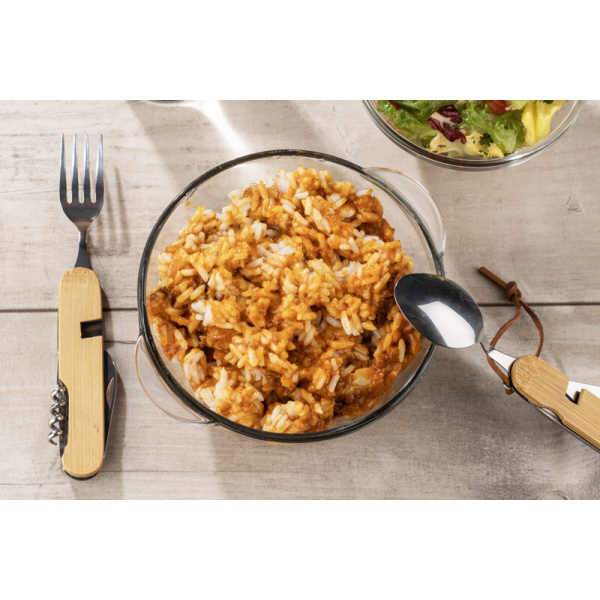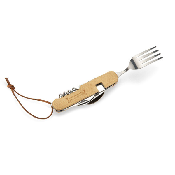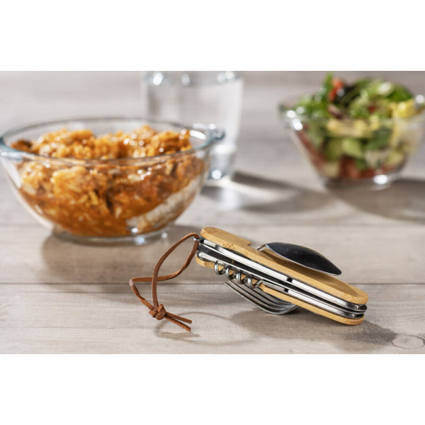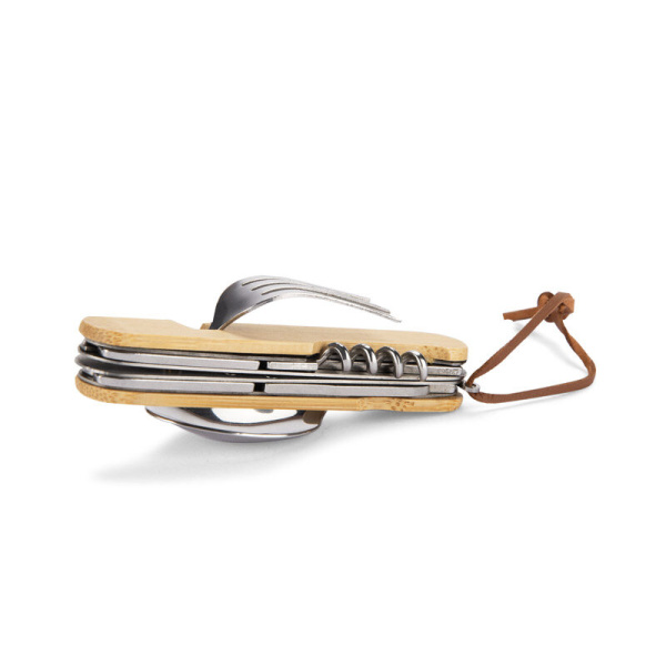 KENTO ceļojumu galda piederumu komplekts ir daudzpusīgs risinājums piedzīvojumiem brīvā dabā, kas ietver nazi, dakšiņu, karoti, korķskrūvi, pudeļu atvērēju un skrūvgriezi. Šis 6-in-1 funkcionalitātes sīkrīks ietaupa vietu un ir ideāli piemērots jebkurai situācijai ārpus telpām. Dabīgais bambusa apvalks piešķir tam videi draudzīgu izskatu, vienlaikus nodrošinot izturību un vieglumu. Komplektā iekļautā siksna ļauj viegli piestiprināt pie mugursomas vai jostas. KENTO ir ideāla izvēle piedzīvojumu entuziastiem un praktiskiem risinājumiem.