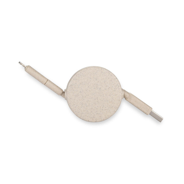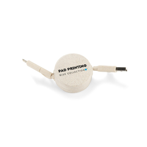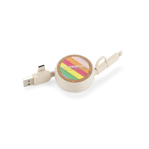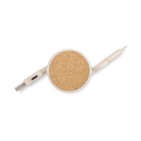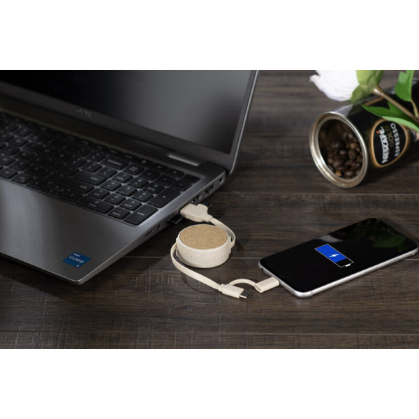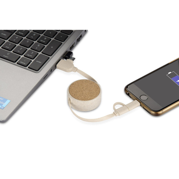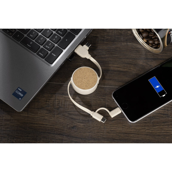 SLOPI uzlādes kabelis apvieno dabīgus materiālus ar funkcionalitāti. Izgatavots no korķa un kviešu salmu plastmasas, tam ir USB, 2 x USB C un Lightning savienotāji, kas nodrošina daudzpusību un ērtības. Tā spolētais dizains padara to viegli uzglabājamu, savukārt dabiskais izskats piešķir tam unikālu raksturu. Ideāli piemērots kā praktisks reklāmas sīkrīks.
