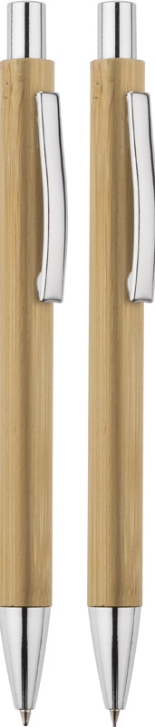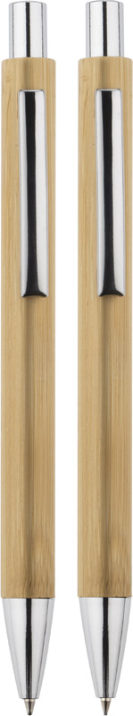 MAMBOO rakstīšanas komplekts sastāv no pildspalvas un automātiskā zīmuļa, kas iepakots brūnā, videi draudzīgā kartona kastē. Gan pildspalvas, gan zīmuļa korpuss ir izgatavots no dabīga bambusa. Chrome apdare piešķir tai eleganci. Zila pildspalvas uzpilde, mehāniskais zīmulis 0,7 mm biezs.
