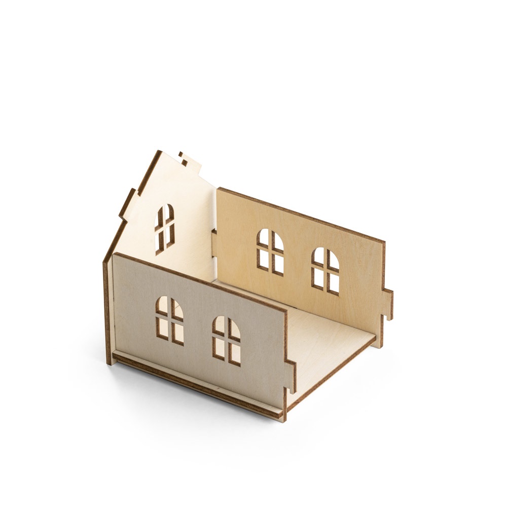 Dekoratīva saplākšņa māja aprīkota ar auklu, lai pakārtu pie Ziemassvētku eglītes. To var izmantot kā dāvanu kastīti.